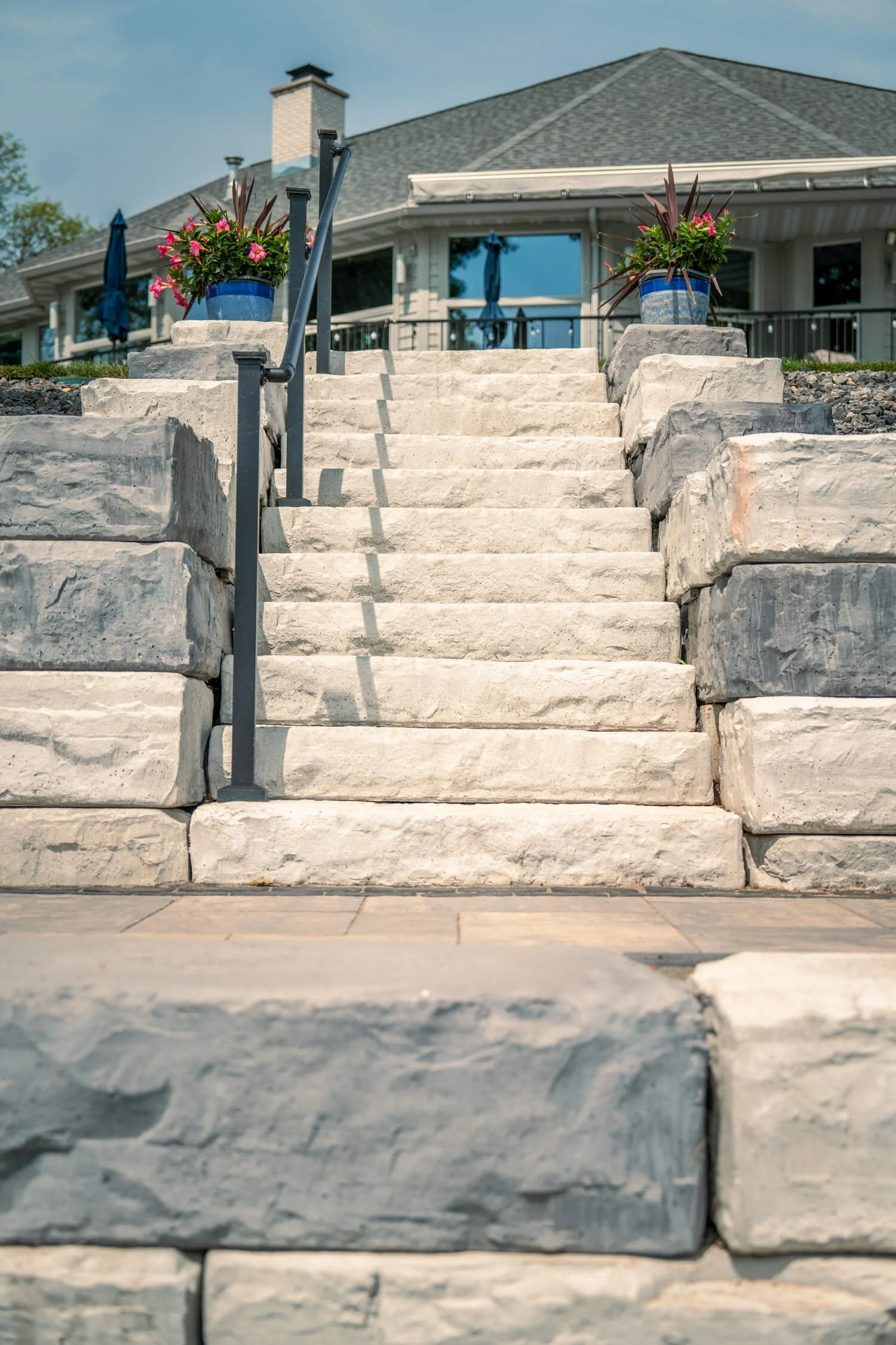 In the fall of 2024, our team at Van Zeeland Nursery & Landscape designed and constructed a multi-level retaining wall system using High Format Grand Ledge and Kodah wetcast concrete block. These materials were chosen not only for their strength, but for their ability to reflect the texture and warmth of natural stone, blending seamlessly with the surrounding oaks and shoreline.